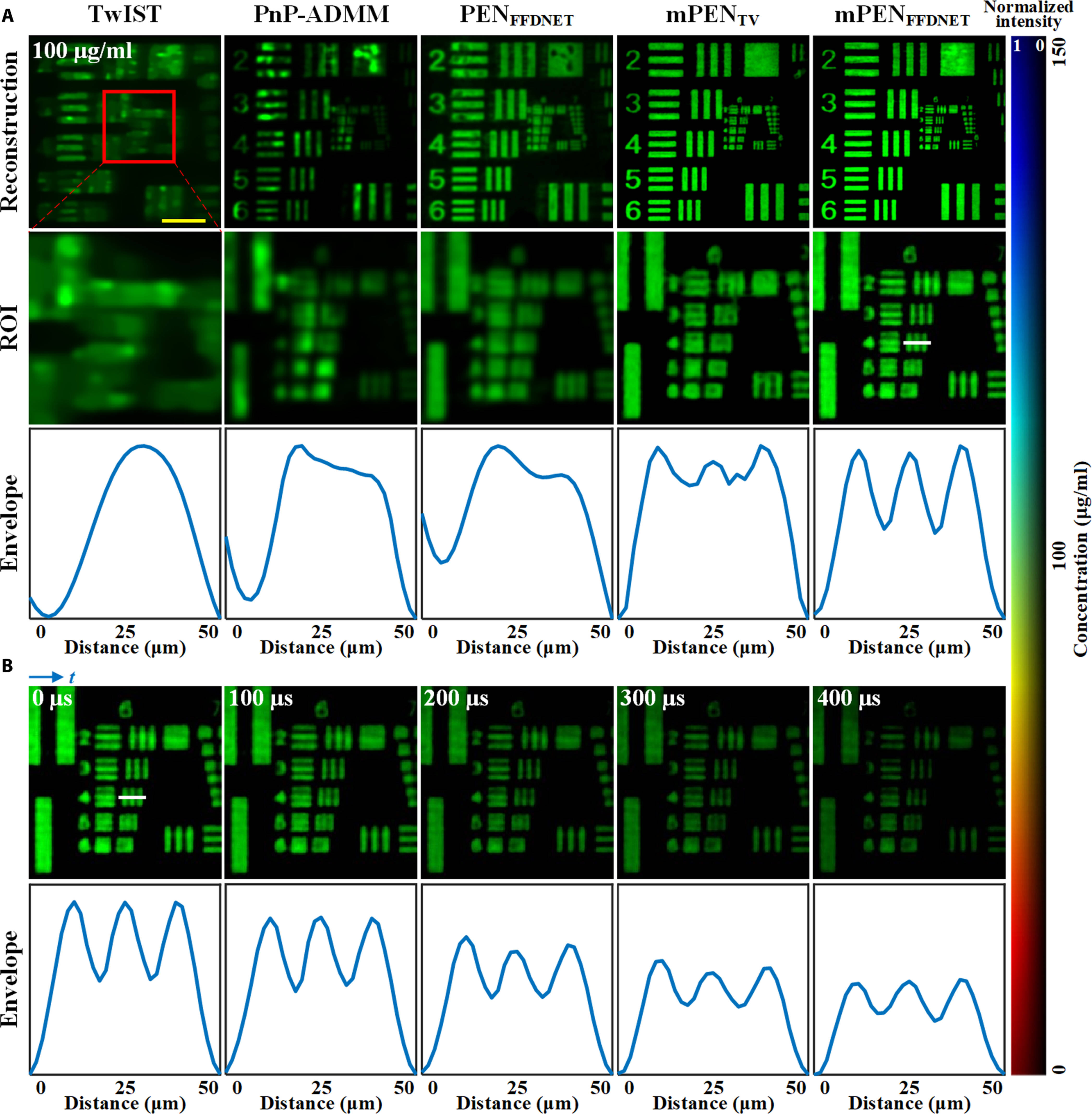 图3.空间分辨率对比结果。(a)对比TwIST、PnP-ADMM等之前方法,最右列mPENFFDNET方法清晰分辨了分辨率板的细节,实现了约3.56倍(较基于TwIST的传统COSUP方法)的分辨率提升。(b)动态重构序列与截线强度曲线(白线处),验证了动态分辨率一致性。