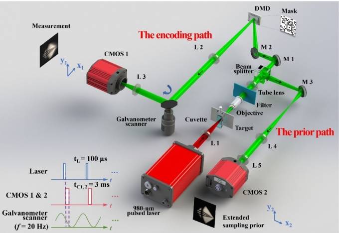 该系统采用脉冲激光作为激发光源,并通过数字微镜器件(DMD)加载伪随机图案对动态场景进行空间编码。动态场景的光信号被划分为两个路径:在编码路径中,通过振镜扫描将时间信息转化为空间剪切偏移,并由CMOS相机捕获;在先验采样路径中,另一台同步的CMOS相机直接采集场景的未编码积分图像。系统通过数字延迟发生器与信号发生器协同调度,实现对光源、振镜与双相机的精密同步控制。最终,该系统结合人工智能赋能的图像重建方法,在维持高空间分辨率的同时,实现了高保真的高速动态成像。