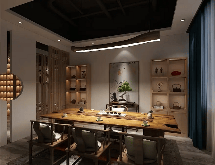 1. 色温与层次:主光源2700K-3000K暖黄光;茶台、展柜用可调射灯(3000K,30°光束角);间接照明(灯带藏于吊顶/格栅)营造氛围感;严禁刺眼主灯。